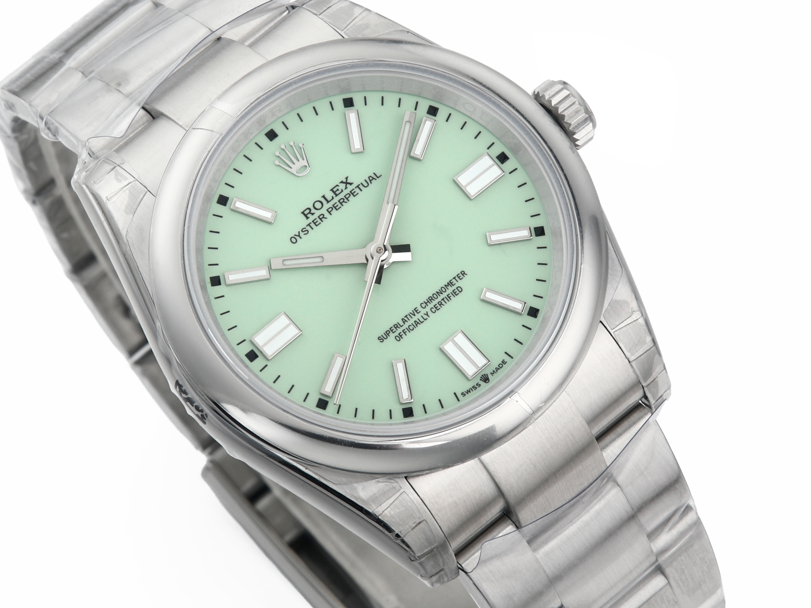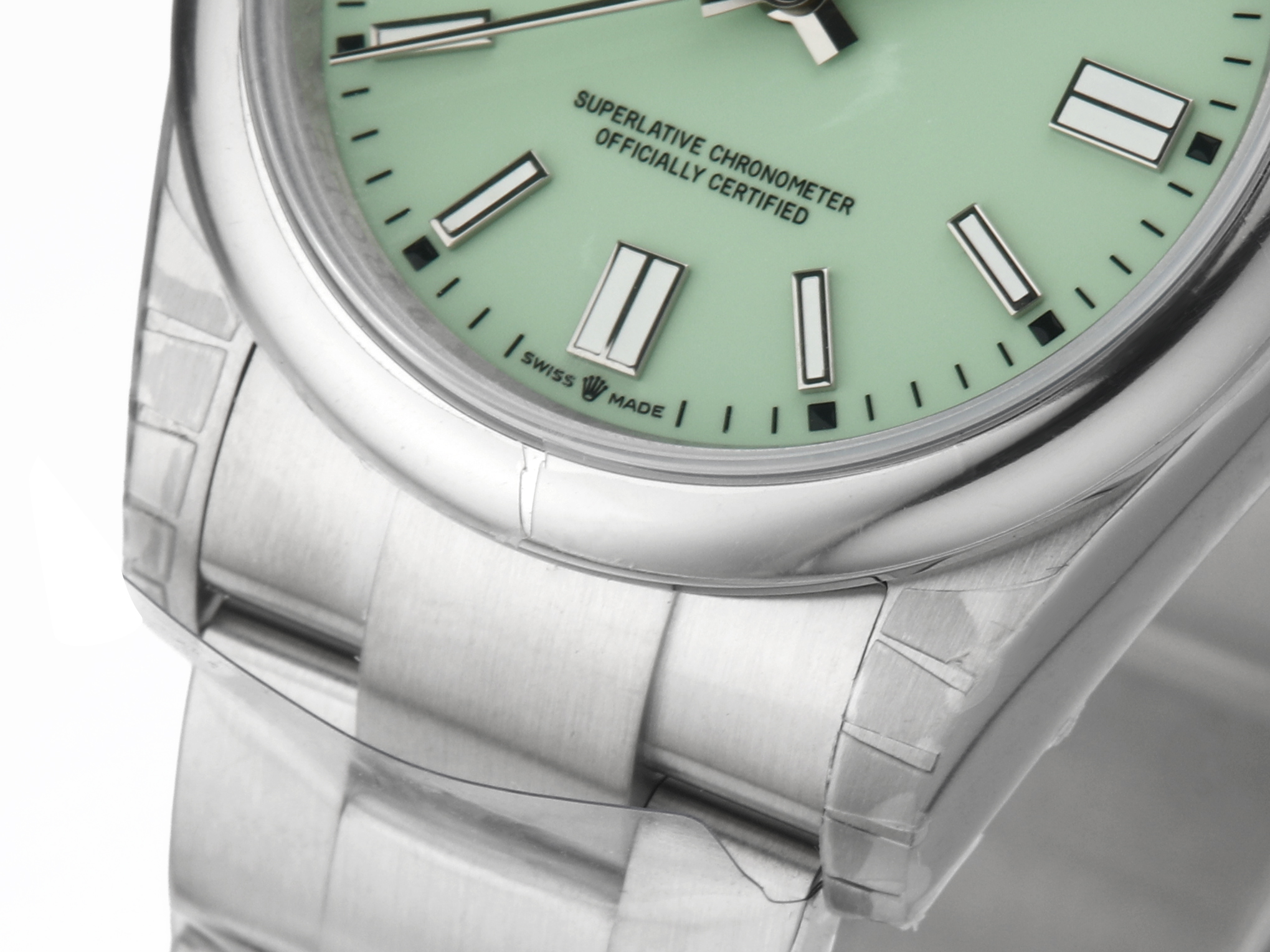 The Oyster Perpetual 36 features a vibrant pistachio green matte lacquer dial, crafted with meticulous layering to achieve a rich, smooth finish. Housed in a durable 36mm Oystersteel case which is highly resistant to corrosion and topped with a domed bezel and scratch-resistant sapphire crystal, it balances refined elegance with robust protection.